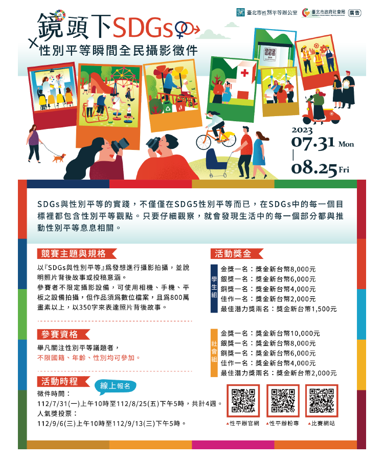 (一)「鏡頭下SDGsx性別平等瞬間全民影像徵件」競賽獎項多 元,社會組獎金高達1萬元。