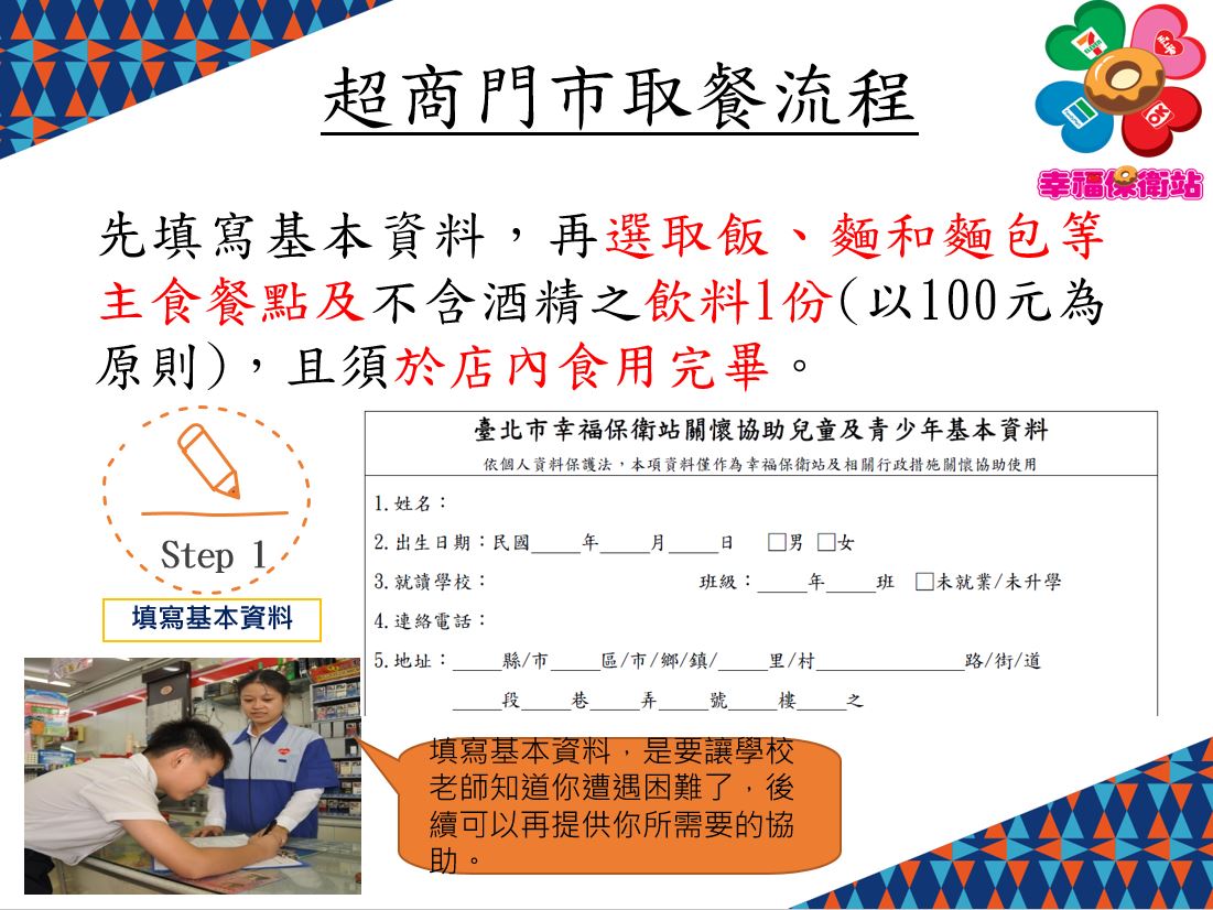 「臺北市幸福保衛站」守護兒少幸福!自113年1月20日起,18歲以下兒童或青少年遭遇緊急變故挨餓時,可至統一、全家、萊爾富、來來(OK)超商求助取餐。