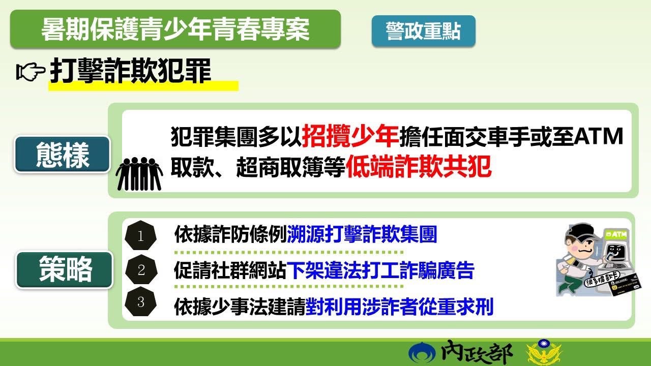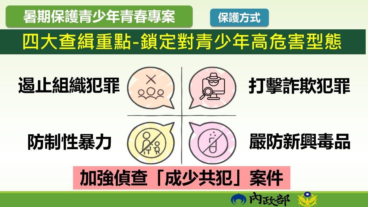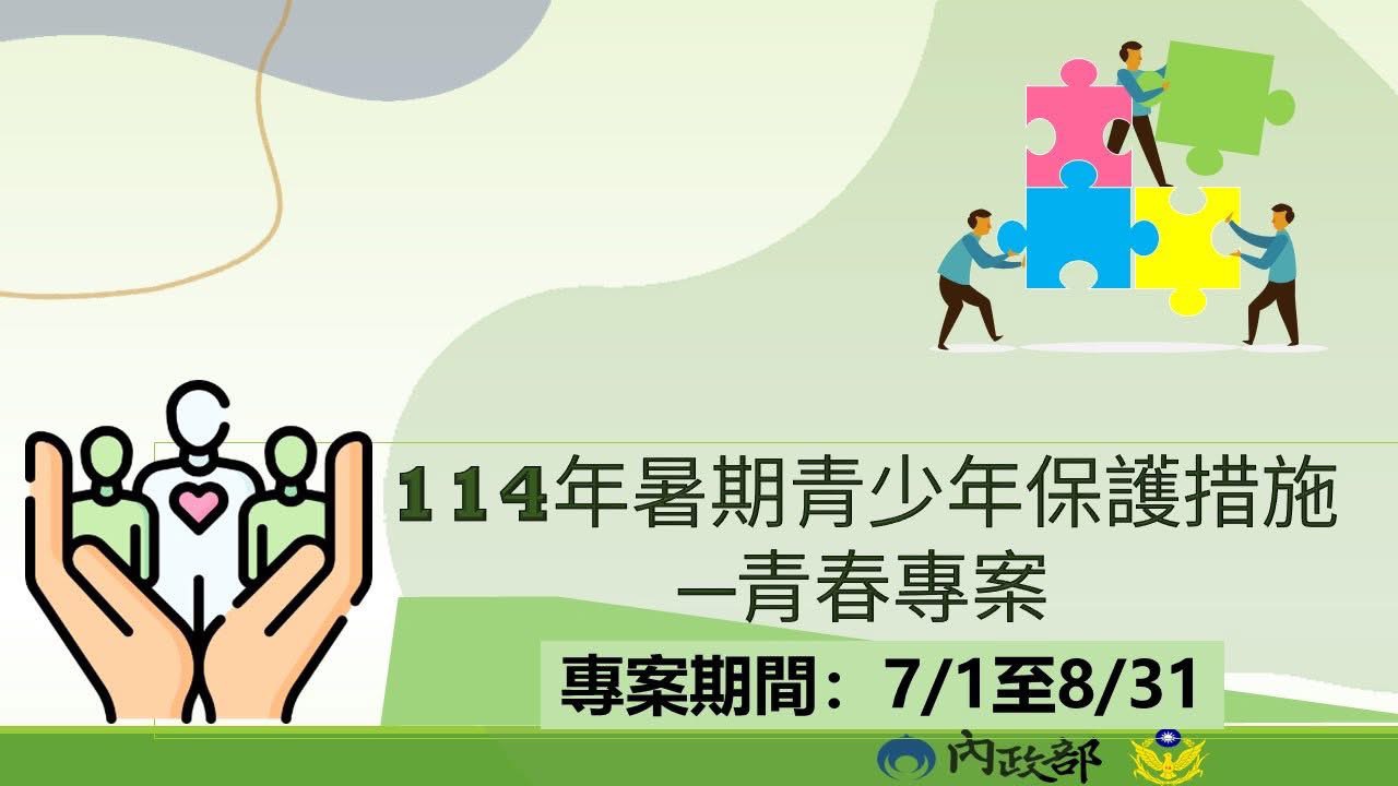 為於暑假期間加強保護青少年安全,避免遭受安全及不法危害,行政院自114年7月1日起實施「114年暑期保護青少年青春專案」,彙整各部會暑期相關保護措施,透過「精準查察」及「有效宣導」手段,避免青少年曝露觸法風險及預防涉入犯罪。