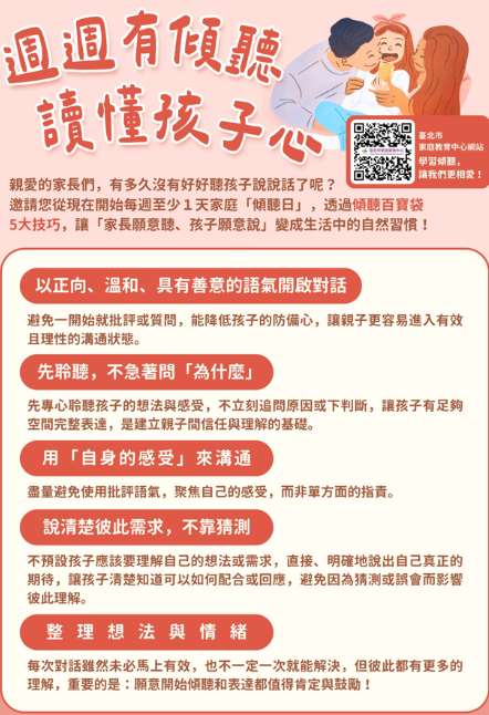 二、本市「傾聽日」相關資源將陸續上架於本市家庭教育中心網站(網址:https://family.gov.taipei/Default.