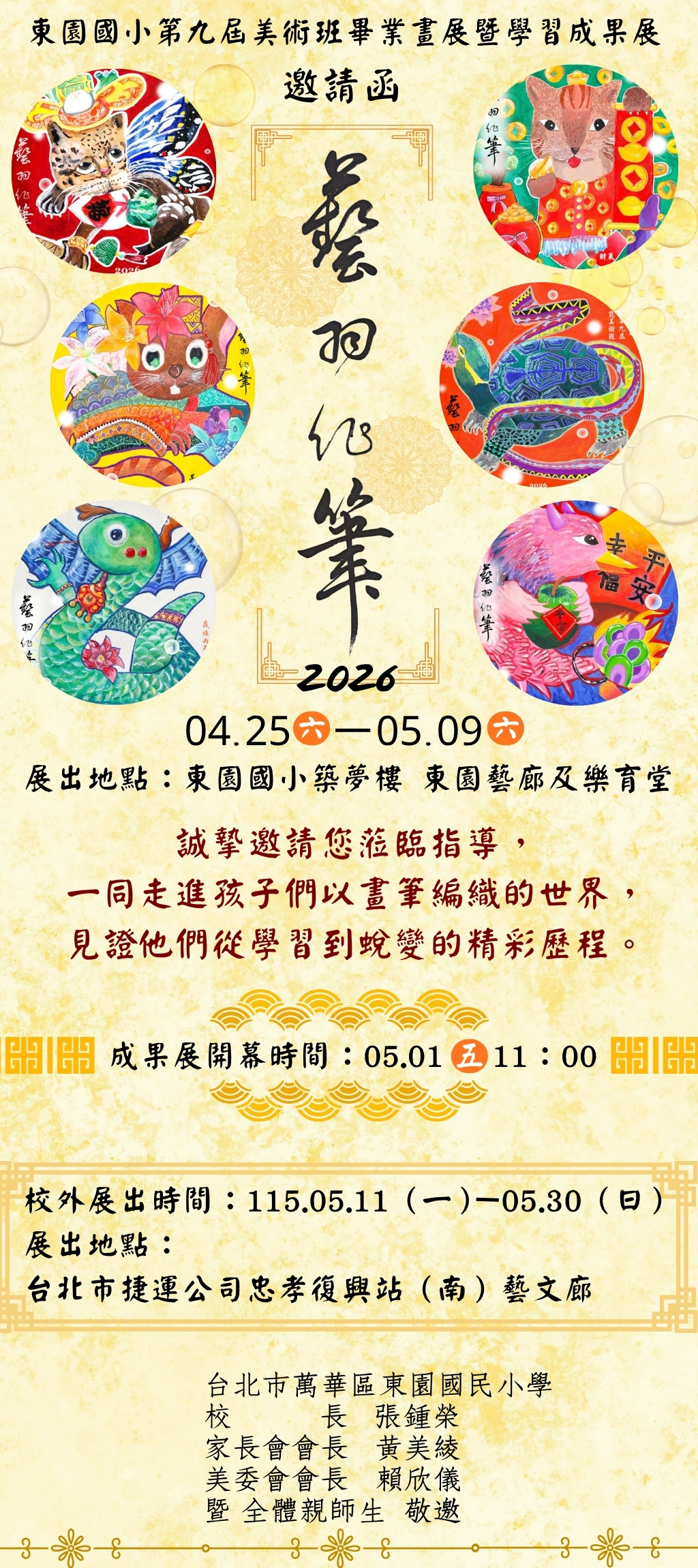 說明: 一、本校藝術才能美術班辦理旨揭成果展,畫展主題為【藝羽 化筆】。 二、畫展相關訊息如下: (一)展覽日期:115年4月25日(星期六)至115年5月9日(星 期六),時間為展期每日上午9時至下午4時。 (二)展覽地點:本校竹夢樓1樓【東園藝廊】及勤學樓3樓 【樂育堂】。 (三)開幕時間:115年5月1日(星期六)上午11時,地點為竹 夢樓1樓演藝廳。